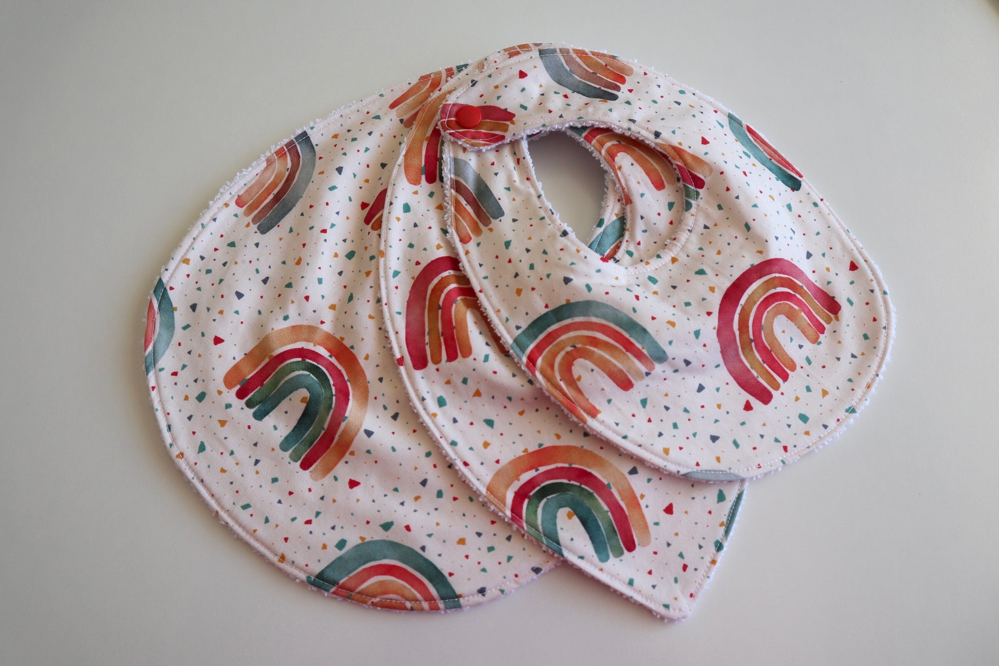 Our handmade bibs have an absorbent towel backing and a soft, 100% cotton, stylish print fabric for the front. Great for absorbing up all your babies dribble.