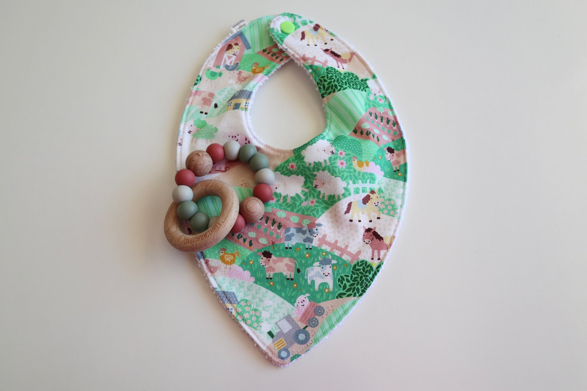 Our handmade bibs have an absorbent towel backing and a soft, 100% cotton, stylish print fabric for the front. Great for absorbing up all your babies dribble.